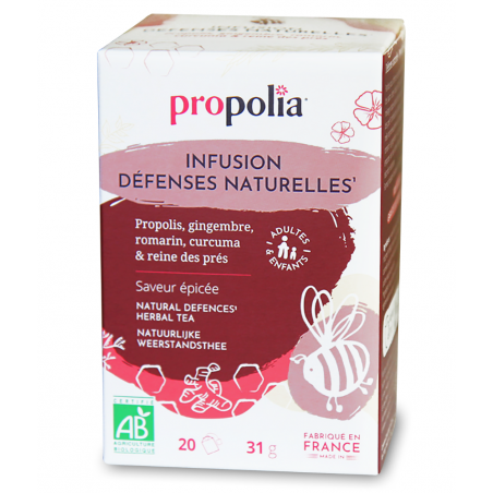 Cette infusion BIO allie plaisir et bienfaits avec un mélange unique associant propolis, plantes et épices. La reine des prés1 contribuant aux défenses immunitaires du corps se mêle harmonieusement aux plantes bienfaisantes telles que le romarin, le gingembre, le curcuma et la cannelle. La propolis, sélectionnée pour sa pureté, complète cette formule. Laissez-vous emporter par ses arômes chaleureux et épicés, procurant un réconfort instantané.