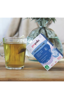 Idéale pour bien préparer votre corps et votre esprit au repos nocturne, cette infusion Bio est un mélange unique et subtil de propolis, sélectionnée pour sa pureté, et de 4 plantes reconnues. L'alliance du tilleul, de la guimauve, du romarin et de l'oranger donne à cette préparation un goût très doux et agréable à consommer au moment du coucher.