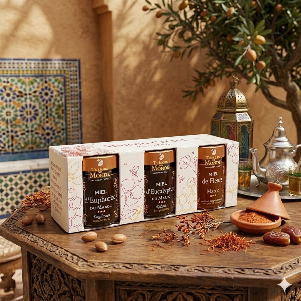 Coffret d'exception réunissant trois grands crus de miels du Maroc : Eucalyptus, Euphorbe et Fleurs. Une sélection rare aux arômes profonds et envoûtants, symbole d'un savoir-faire ancestral et d'une nature préservée.