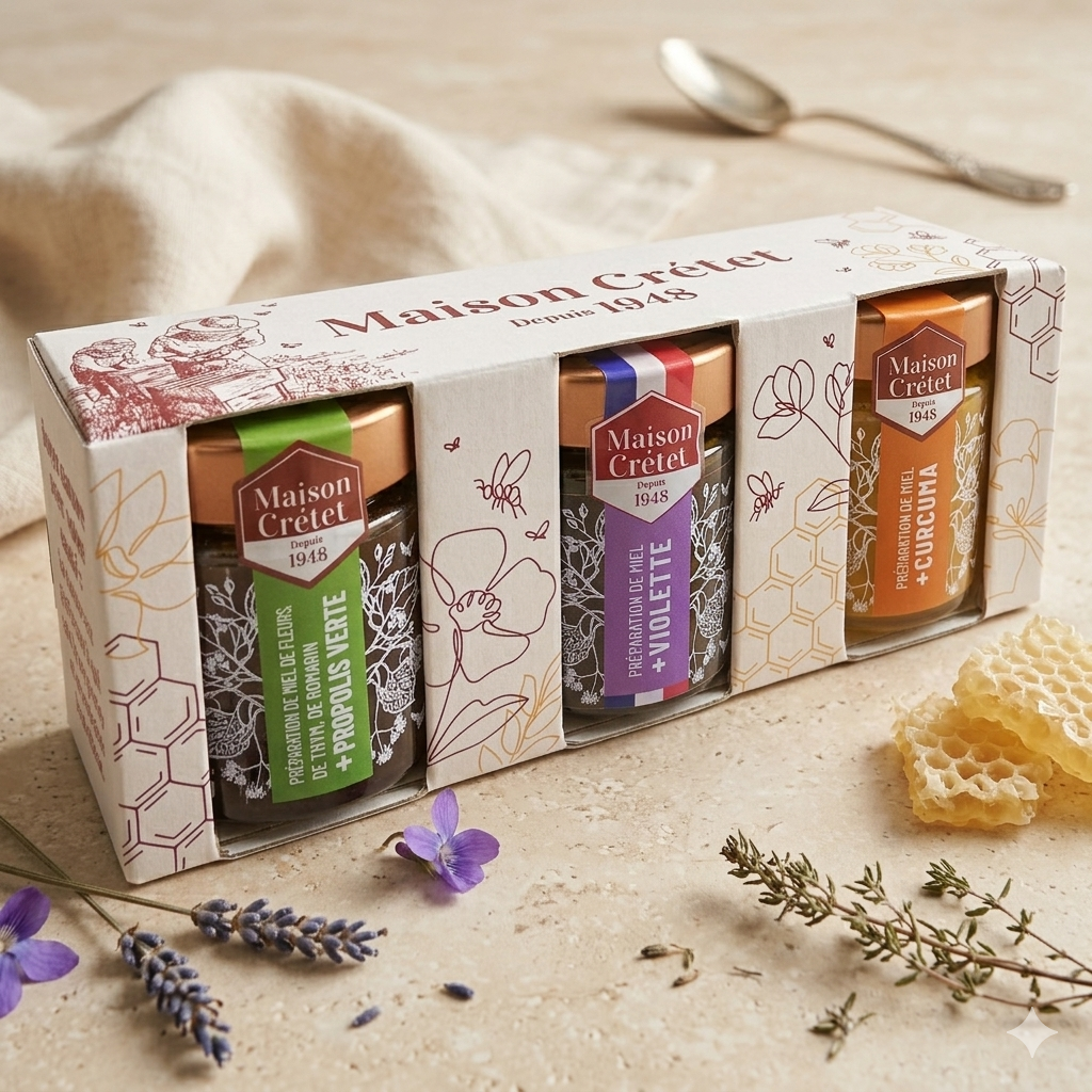 o Préparation miel romarin, thym & propolis verte : une composition de caractère, aux notes intenses et naturelles. Offrez une nouvelle façon de savourer le miel avec ce coffret premium, où chaque pot raconte une histoire et transforme le quotidien en expérience unique.