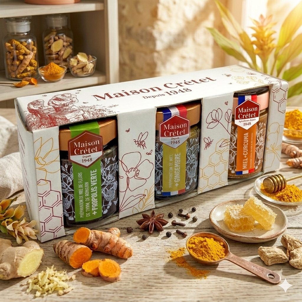 o Préparation miel romarin, thym & propolis verte : une composition de caractère, aux notes intenses et naturelles. Offrez une nouvelle façon de savourer le miel avec ce coffret premium, où chaque pot raconte une histoire et transforme le quotidien en expérience unique.